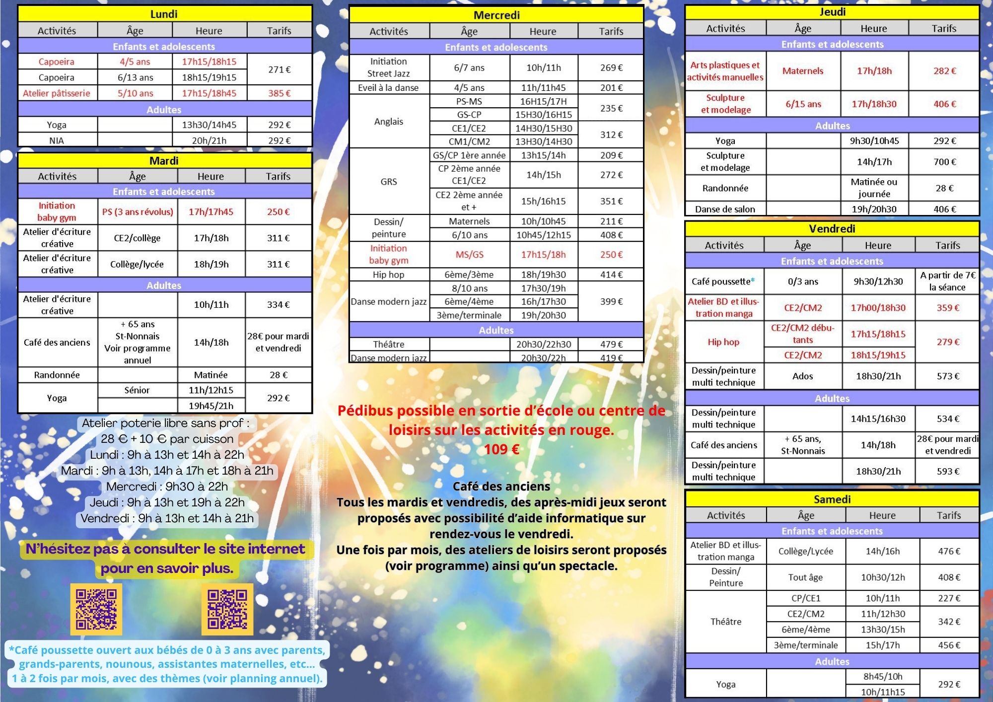 - une vingtaine d’activités manuelles, culturelles, corporelles, physiques et musicales animées par une équipe motivée :