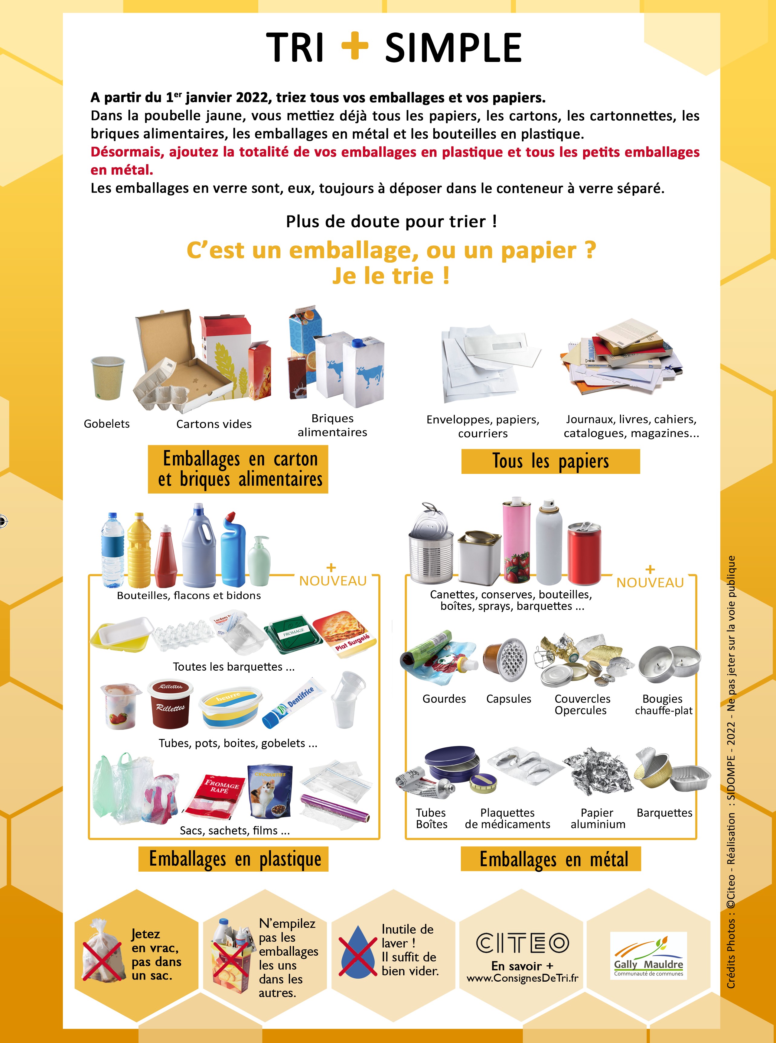 Depuis le 1er janvier 2022, vous devez déposer TOUS VOS EMBALLAGES et VOS PAPIERS dans le bac jaune. C’est un geste simple qui bénéficie à tous !